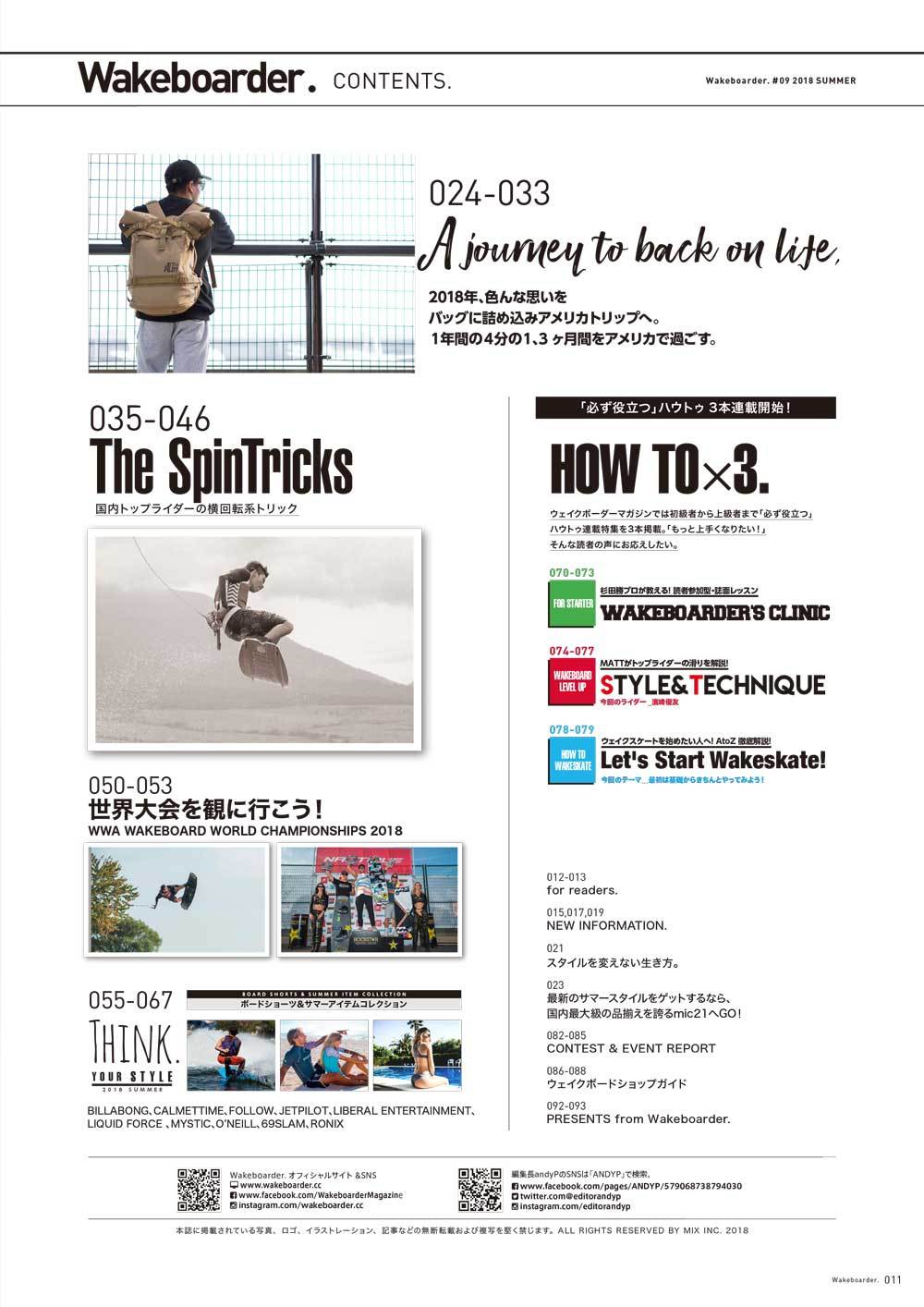 【第1特集】「本場アメリカへのウェイクボードトリップ」【第2特集】「The SpinTricks〜国内トップライダーのスピントリック特集」【第3特集】「サマーアイテム特集」トランクス、スイムウェア、ラッシュTシャツなど盛り沢山。【ハウトゥ大特集】①ウェイクボード・クリニック(初級編)/4P、②ライダーズ・スタイル&テクニック/4P、③ウェイクスケート・ハウトゥ/2P【大会レポート】シーズン到来。各大会のリザルト&レポート