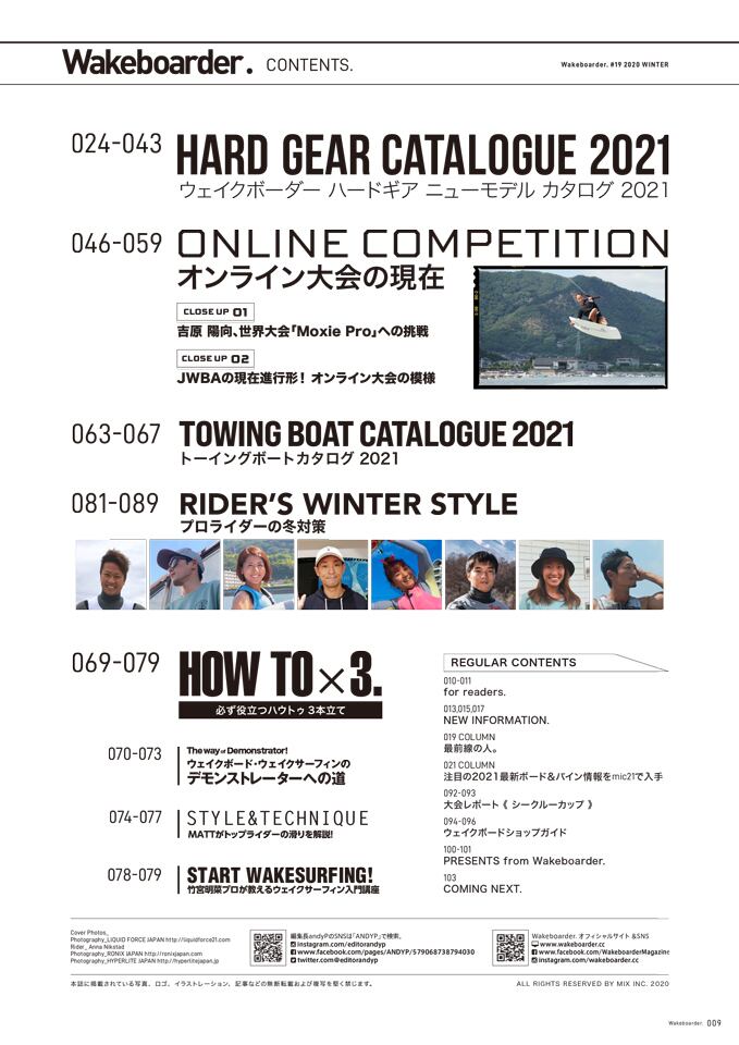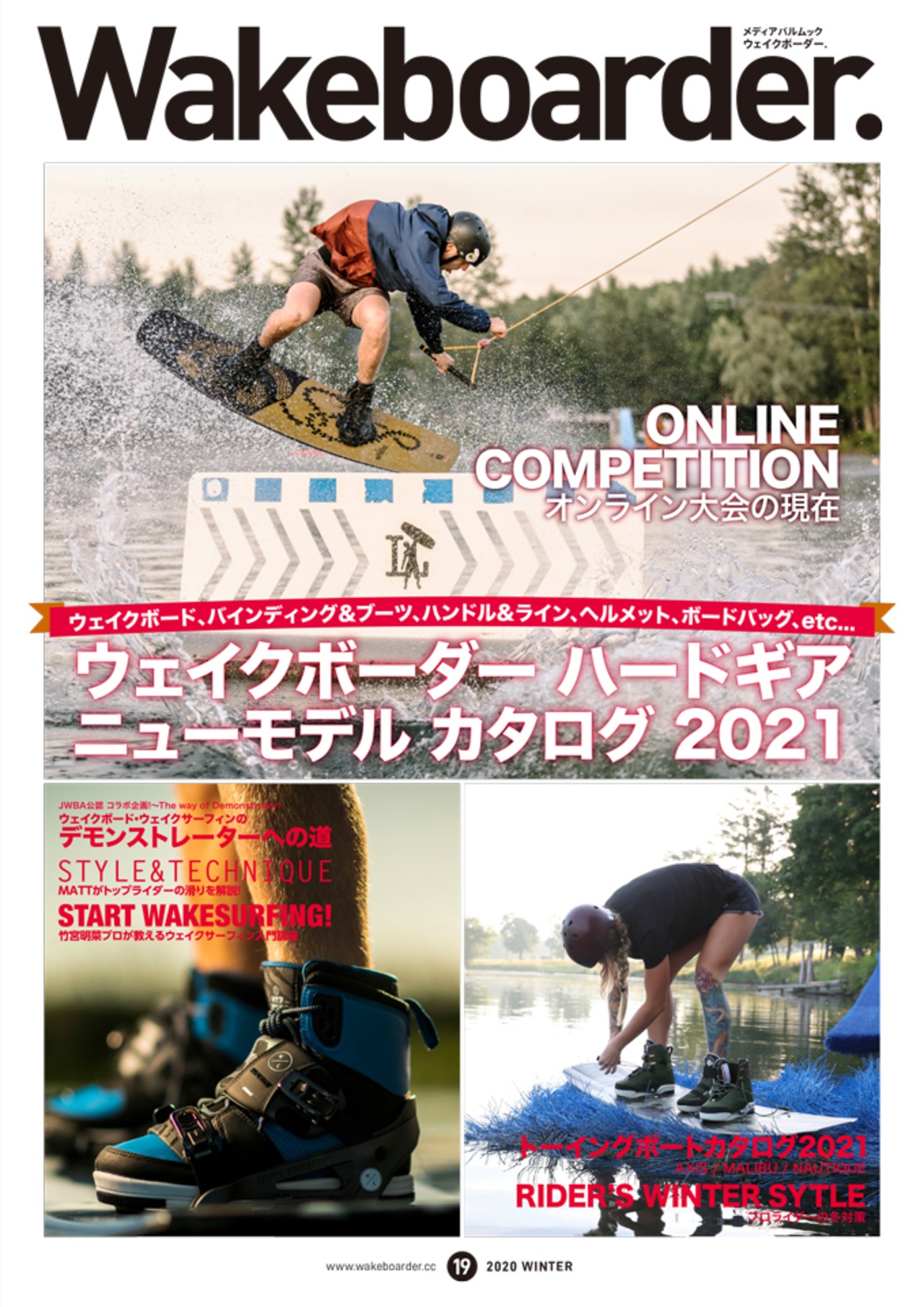 【第1特集】「ウェイクボーダー ハードギア ニューモデルカタログ2021」※ウェイクボードのハードギアの最新ラインナップを最新ギアカタログとして紹介!【第2特集】「オンライン大会の現在」コロナ禍で最近増えたオンライン大会の現状と対策。【第3特集】ウェイク専用ボートカタログ2021。【第4特集】「RIDERS WINTERSTYLE」プロライダーの冬対策をご紹介! 【ハウトゥ連載特集】①「デモンストレーターへの道・検定レッスン」、②「STYLE & TECH・中級者向けスタイリッシュなテクニック特集」、③「Start Wakesurfing!・ウェイクサーフィン入門講座」。