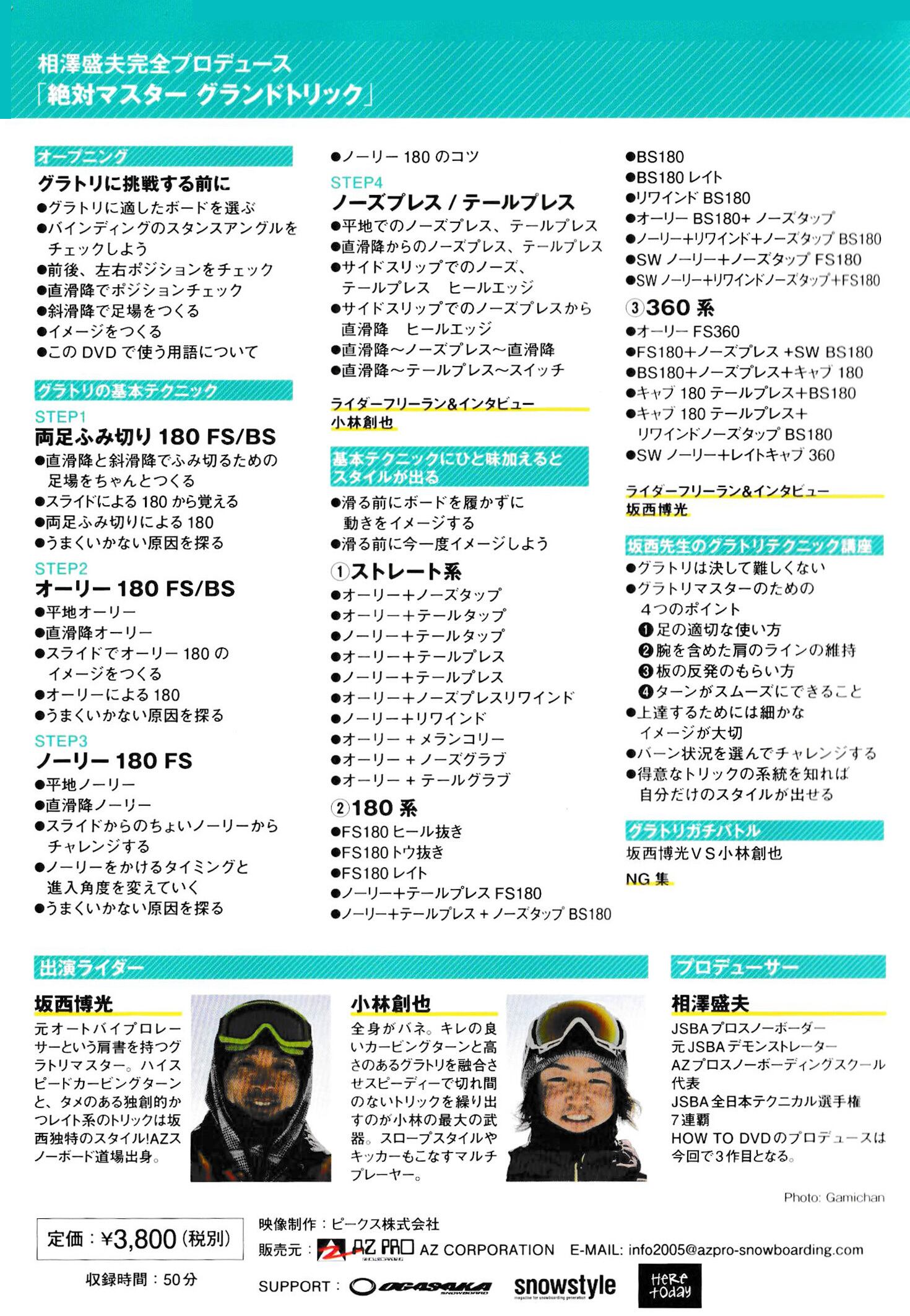ゲレンデの視線を釘付けするグランドトリック。だが、もはやグラトリだけの時代は終わった。これからはハイスピードカービングターンとグランドトリックを融合させた「カービンググラトリ」がカッコいい! このDVDを見て、誰よりも早く、このスタイルをマスターしよう! 相澤盛夫プロデュース HOW TO 第3弾。