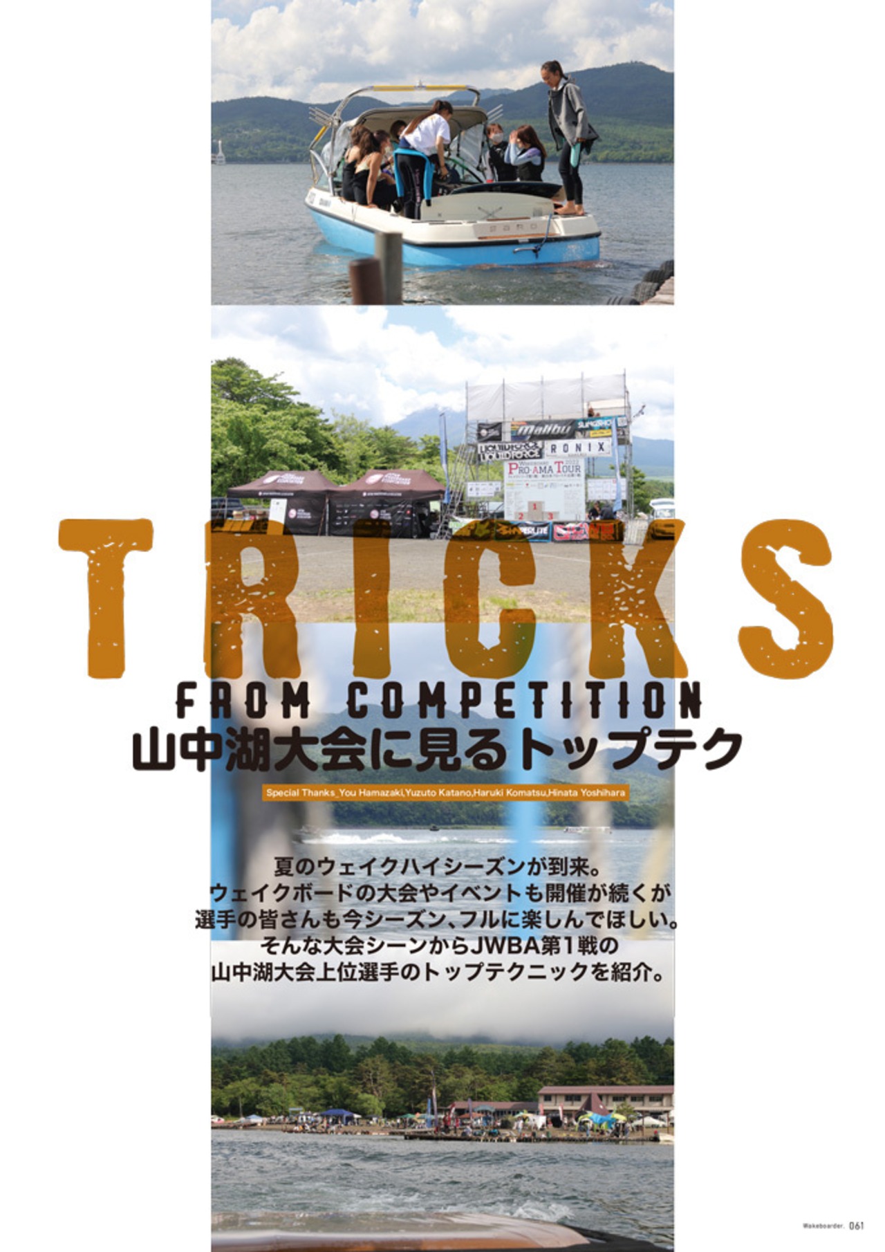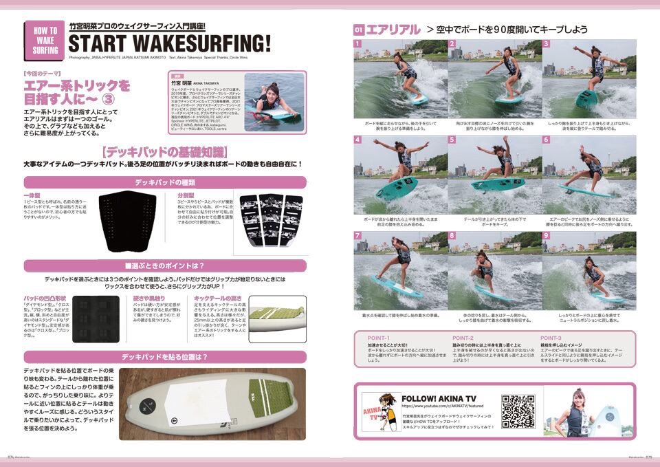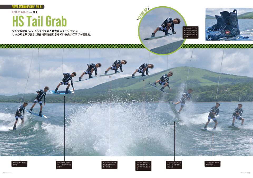 【第1特集】テクニック特集①「RIDERS TECHNIQUE GUIDE 〜高村 泰嘉 & 井上 航平のテクニックガイド 」うまくなるためのテクニック特集。【第2特集】テクニック特集②「山中湖大会に見るトップ選手のテクニック」数々のテクニックをライダーが解説。【第3特集】「人気ブランドのオススメギア」ハイシーズン号として、エントリー層に向けたギアを紹介。【第4特集】「夏のファッション特集」夏のウェイクスタイルをライダーのスナップとともにピックアップ! 【第5特集】「アメリカトリップ特集」トップ選手の海外トリップレポート【ハウトゥ連載特集】①「今さら聞けない! ウェイクボード・ウェイクサーフィン の基礎知識」、②「Start Wakesurfing!・ウェイクサーフィン入門講座」