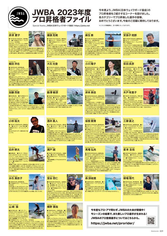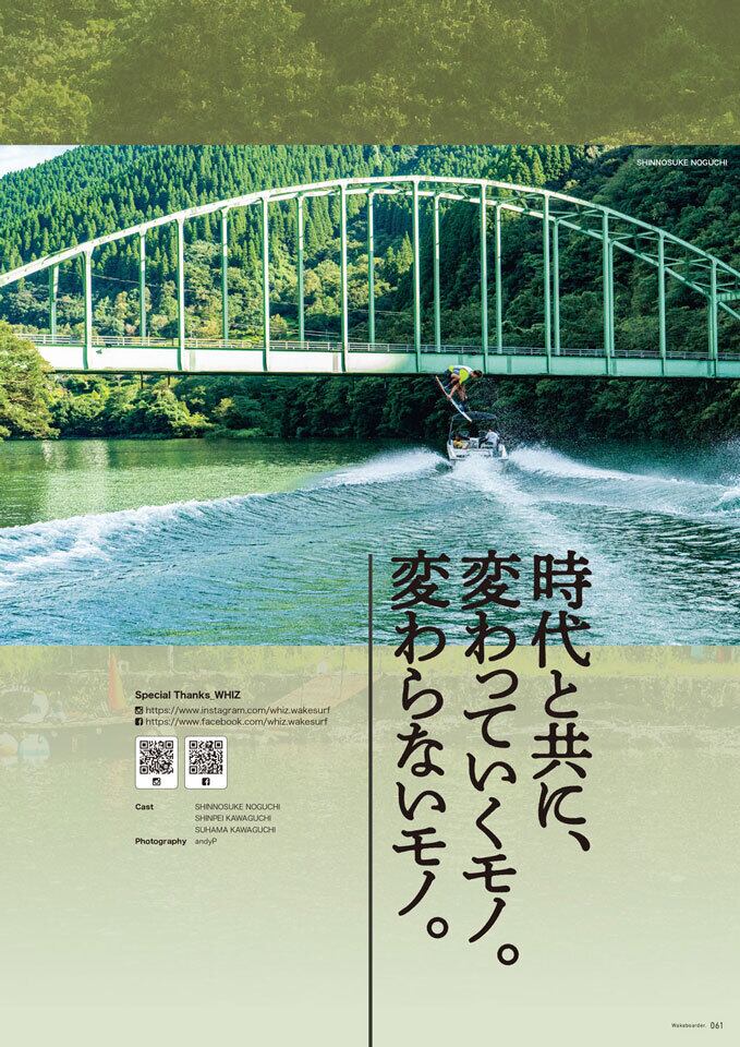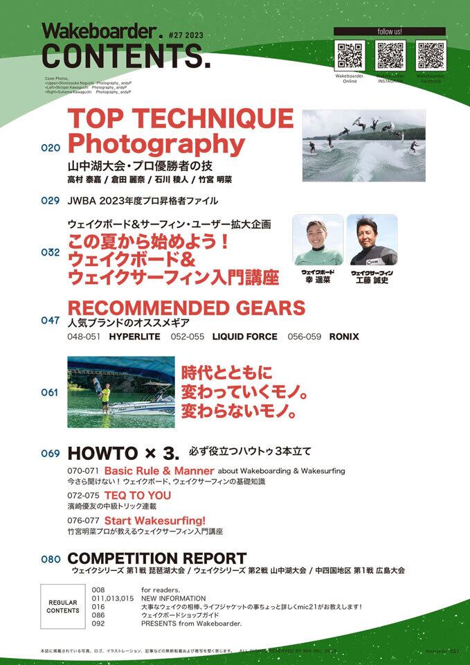 【第1特集】テクニック特集「TOP TECHNIQUE Photography - 山中湖大会優勝者の技」。ツアー優勝プロのインバートトリック。【第2特集】テクニック特集「この夏から始めよう!ウェイクボード&ウェイクサーフィン入門講座」。これから始める方に向けて、基礎知識から解説。【第3特集】「人気ブランドのオススメギア」、女性向けとエントリー層向けのオススメギアのセットアップを紹介。【ハウトゥ連載特集】①「今さら聞けない! ウェイクボード・ウェイクサーフィンの基礎知識」、②「TEQ TO YOU・濱崎優プロによるウェイクボード中・上級レッスン」、③「Start Wakesurfing!・竹宮明菜プロによるウェイクサーフィン入門講座」