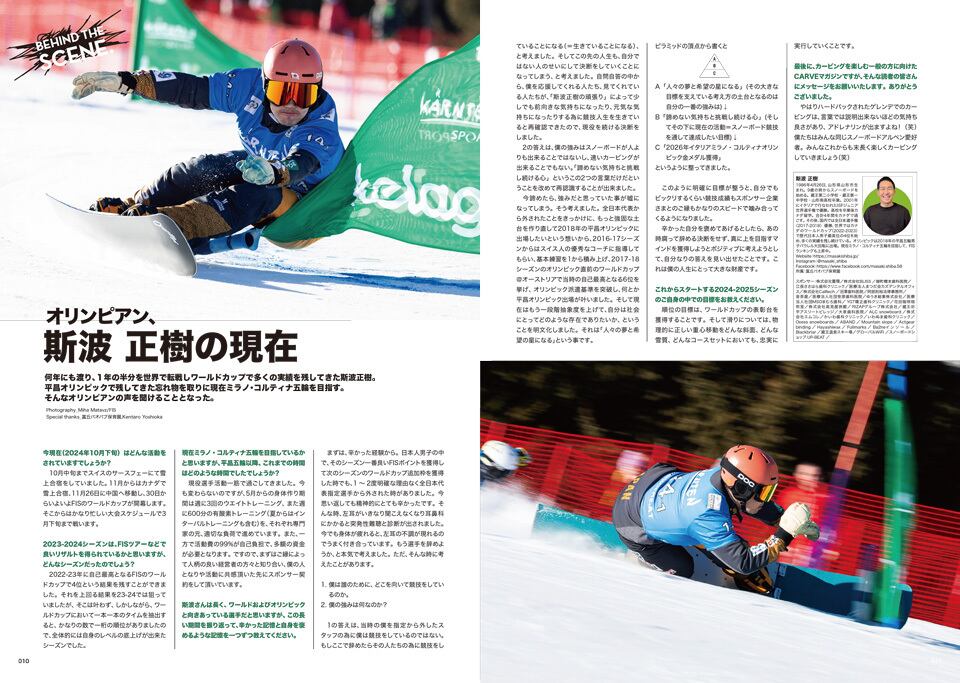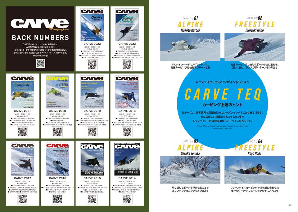 カーヴィングを主軸に置いたスノーボードマガジン「CARVE Magazine」の2024年11月14日発売号。特集内容は、「CARVING PHOTOGRAPHY〜トップライダーからの一言コメント」、「CARVE TEQ〜カービング上達のヒント」、「CARVING DESTINATION〜トップデモが紹介するネコママウンテン」、「CROSS TALK〜(1)本多未沙 & 柏木ゆかり、(2)神野慎之助&吉岡健太郎」、「最新カーヴィングギアカタログ2024-2025」、「RECOMMENDED CARVING COURSE〜シャトレーゼ小海」、「RAMA先生のビッテリー講座」、「二人のトップライダーが開発。スケートボードの秘密」、「PSAプロファイル〜AL & SX プロライダーファイル」、「JSBAデモンストレーターファイル」、「2023-2024大会レポート&リザルト」、他。